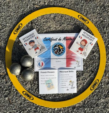 In addition to playing pétanque, we sprinkled in a bit of French language and culture—teaching the kids the warm-up dance “Les Pouces en Avant” (Thumbs Forward), which quickly became a favorite. Each camper received a “Pétanque Passport” and a “Certificat de Mérite” to commemorate their experience—and to share with their family and friends!